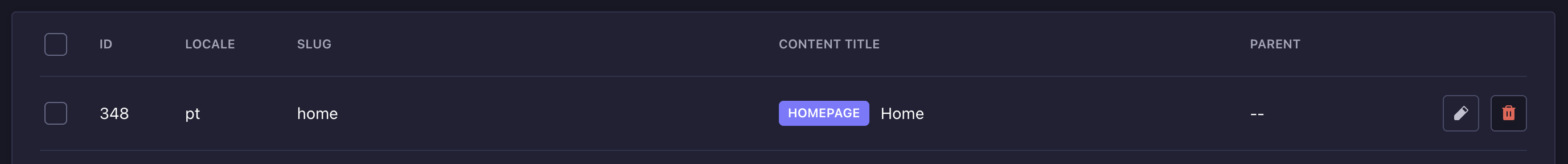 Home pageDefines which document is used as the home page. The content of this document is injected into the template defined within it. Read more about templates. In the list of slugs, the document set as the homepage will display an identification tag.